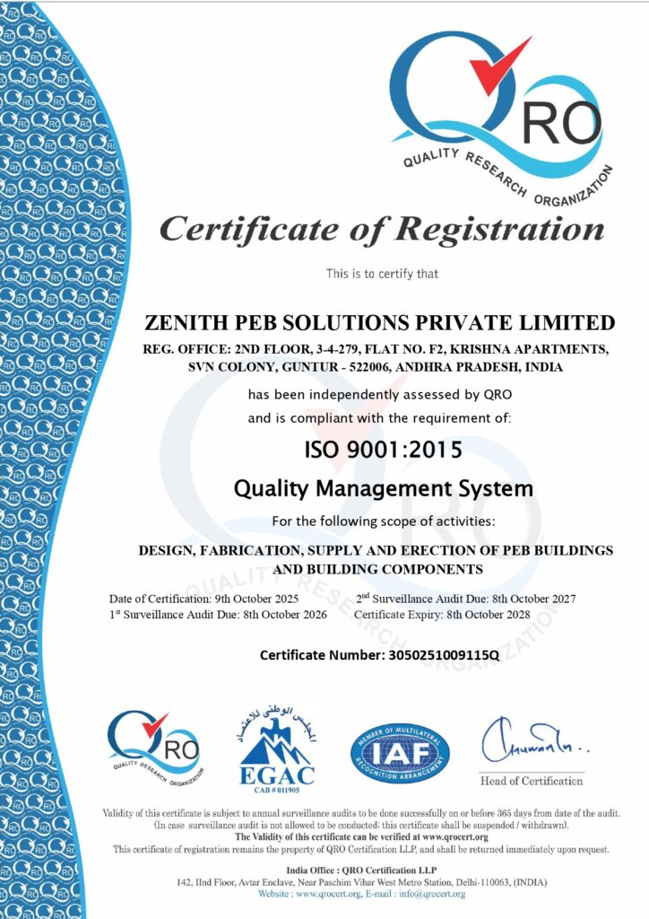 Zenith PEB Solutions Pvt. Ltd. is proud to be ISO 9001:2015 certified by QRO Certification for its design, fabrication, supply, and erection of Pre-Engineered Buildings.